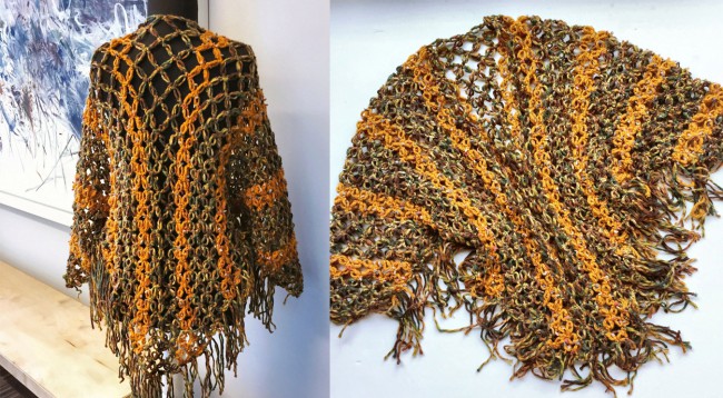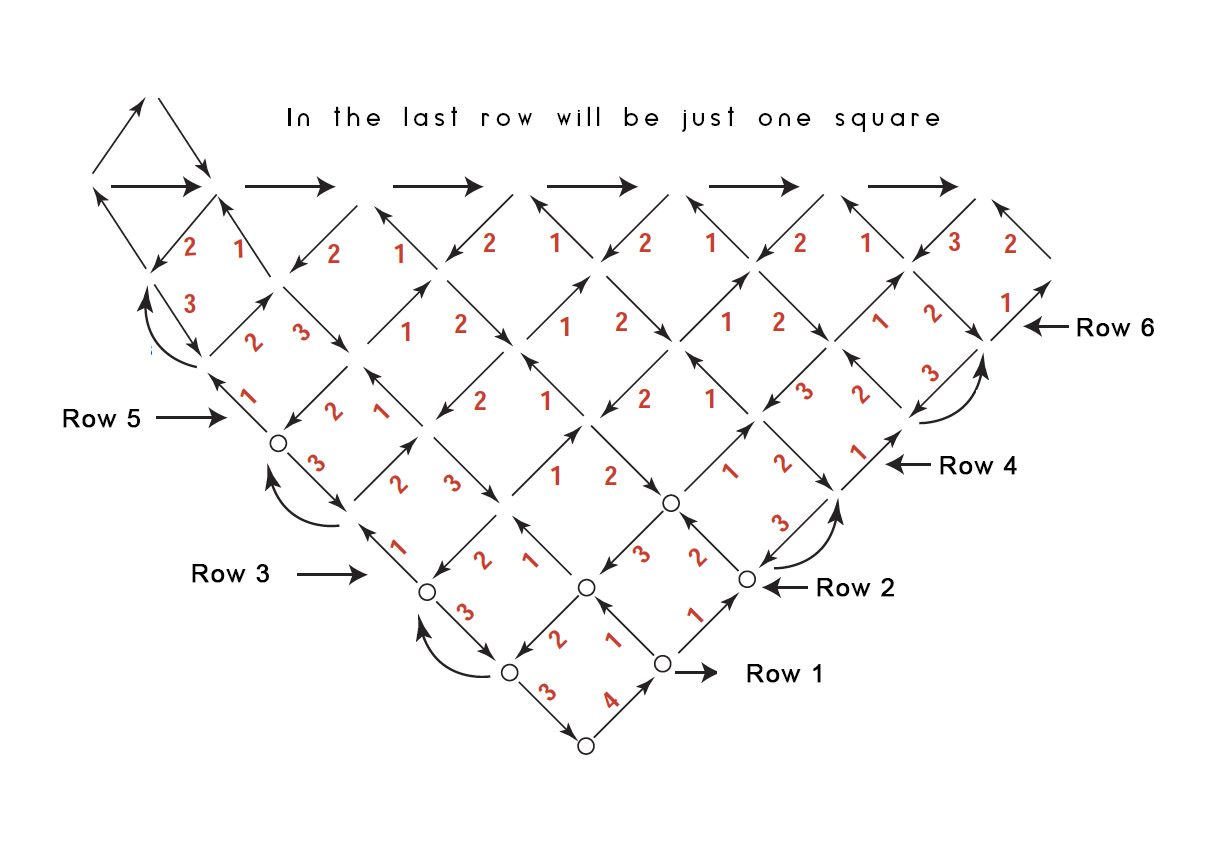 28 rows are knitted and 2 shawls are knitted. Without the final closure of the shawls, the two shawls are joined by a long straight edge and are knitted diagonally and the half of the shawl is joined to the back.