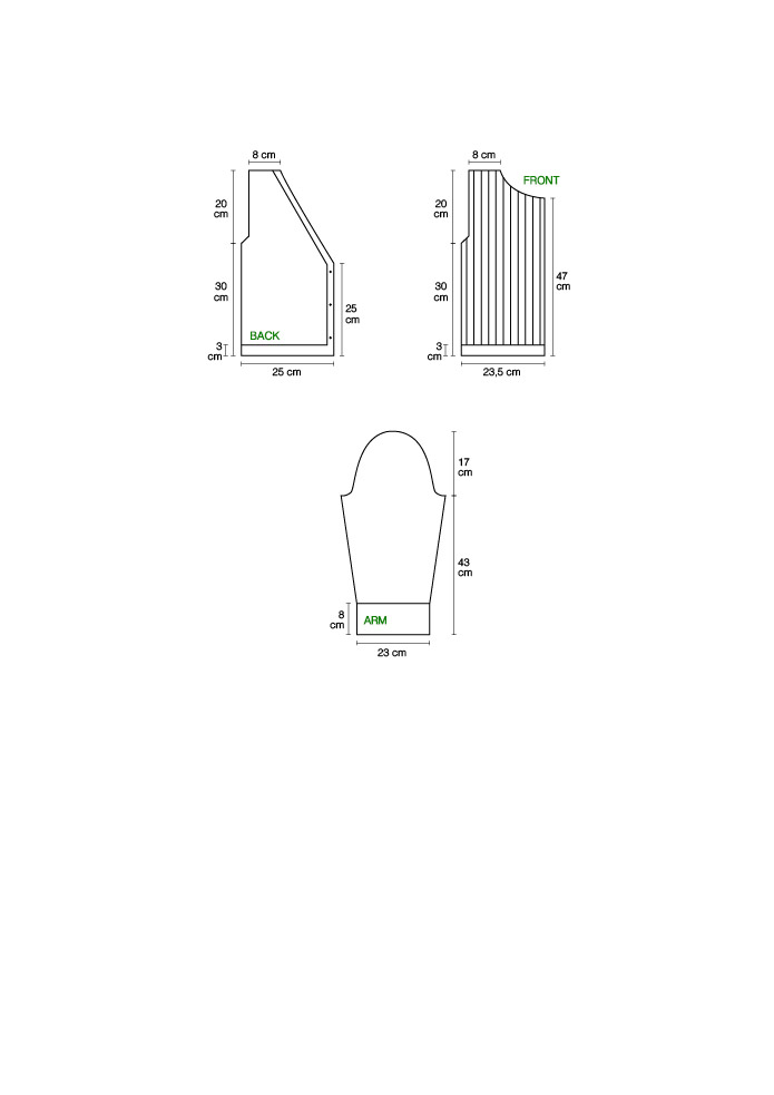 3- When body length is 30 cm, decrease 5+4+3+2+1 stitches at one end for armhole.